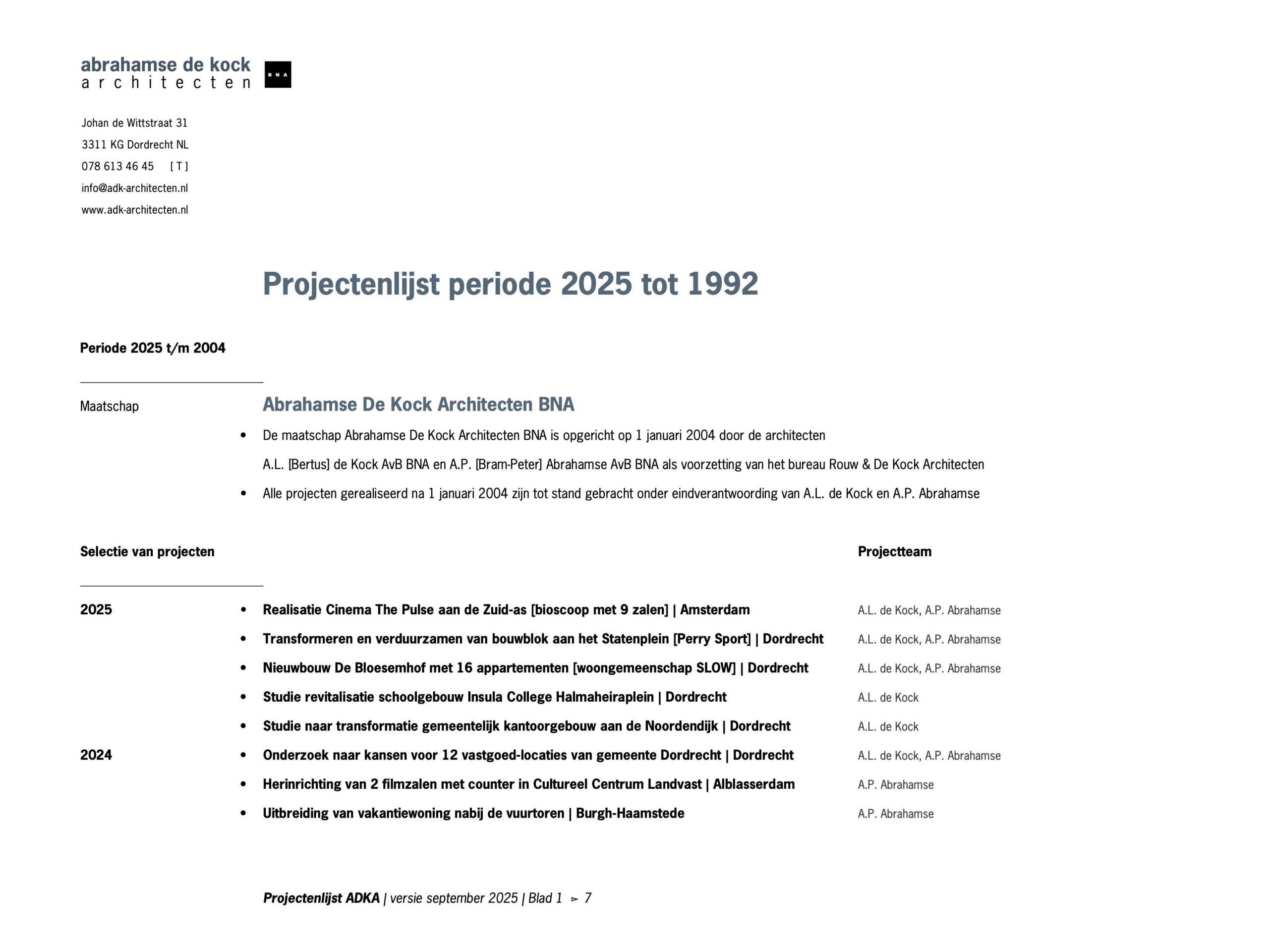 Sinds 1992 heeft Abrahamse De Kock Architecten BNA voor verschillende opdrachtgevers een grote verscheidenheid aan gebouwen en interieurs tot stand gebracht. Deze website toont een aantal projecten en laat zien dat het werk tijdsbestendig is en steeds van een hoge kwaliteit. Elk project is ontworpen vanuit een helder en doordacht concept, heeft een uitgesproken karakter en beoogt een bijdrage te leveren aan een duurzame en plezierige leefomgeving. Gebouwen en interieurs die met zorg en aandacht zijn gemaakt voor de toekomstige bewoner of gebruiker. Verrassende hedendaagse architectuur, die niet zo maar de waan van de dag volgt.