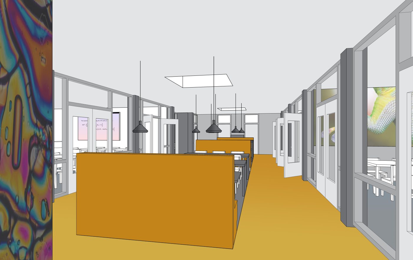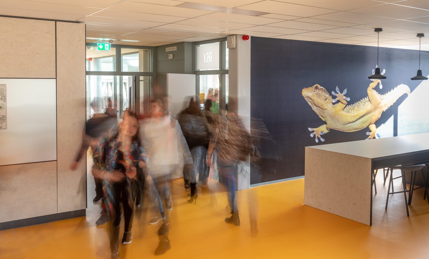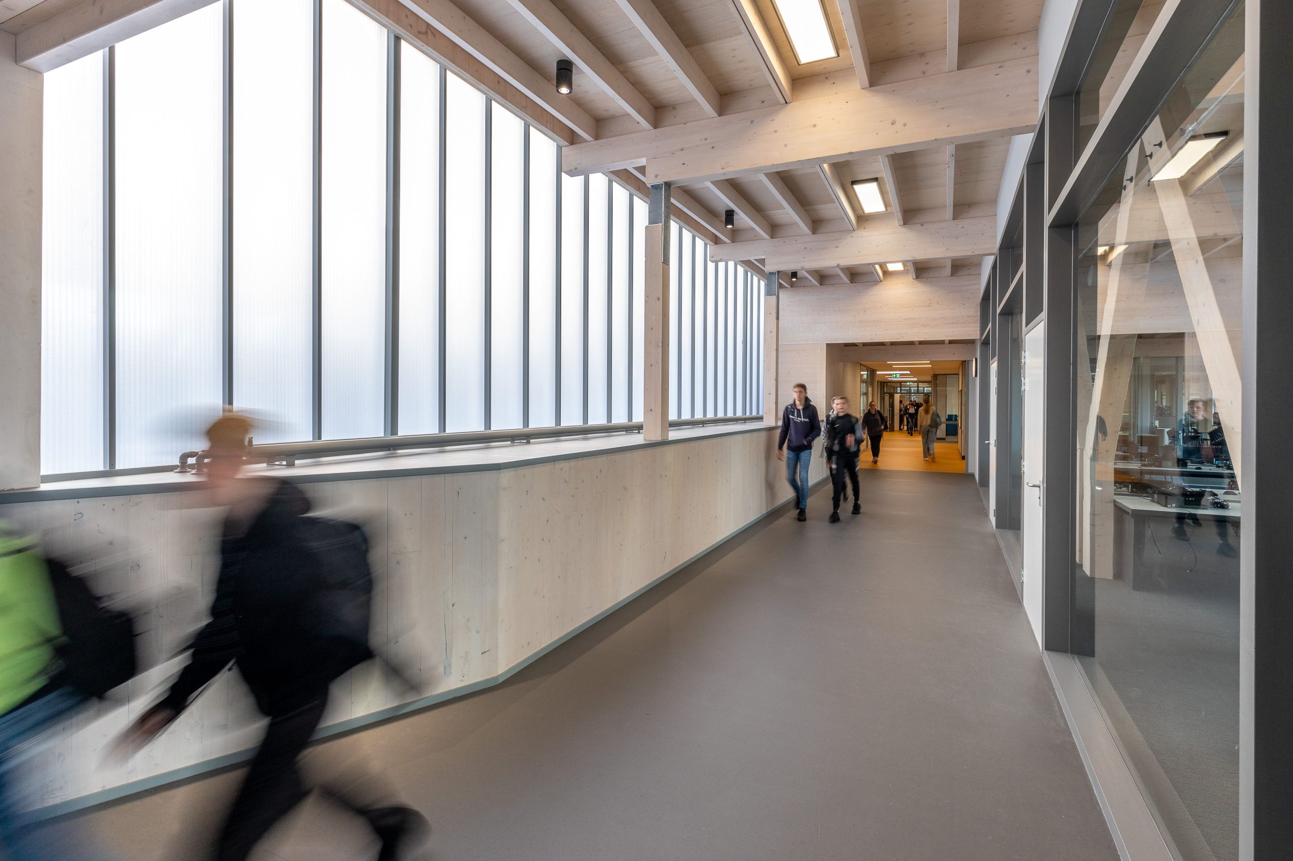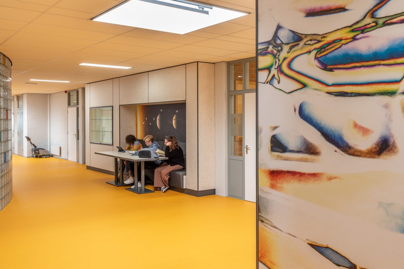 Het ontwerp ondersteunt een onderwijsvisie waarin onderzoekend en projectmatig leren centraal staat. De plekken voor presentatie, ontmoeting en verdieping zijn voorzien van grote afbeeldingen die verwijzen naar de exacte vakken. De gehele inrichting van de ruimten is ook door ons bureau ontworpen. De ruimten worden gevormd door grote houten elementen met doorzicht en vitrines. Het gebruik van de lichte houttinten sluit aan bij de vormgeving van de nieuwe koppeling met de mediatheek. Deze is uitgevoerd in houtbouw: Y-vormige houtconstructies, CLT-wanden en houten ribbenvloeren. Houtbouw is niet alleen duurzaam, maar ook licht van gewicht en de toepassing van prefab elementen zorgden voor een kortere bouwtijd. De verbouwing moest namelijk plaatsvinden in de periode na de eindexamens en de start van het nieuwe schooljaar. Een lange gangzone langs de mediatheek verbindt de bestaande bouwdelen op de verdieping en verbeterd de logistiek. De lange gevel van dit verbindingselement is uitgevoerd in lichte translucente polycarbonaatpanelen, die overdag het licht naar binnen brengen en in de avond juist aan de buitenzijde oplichten.