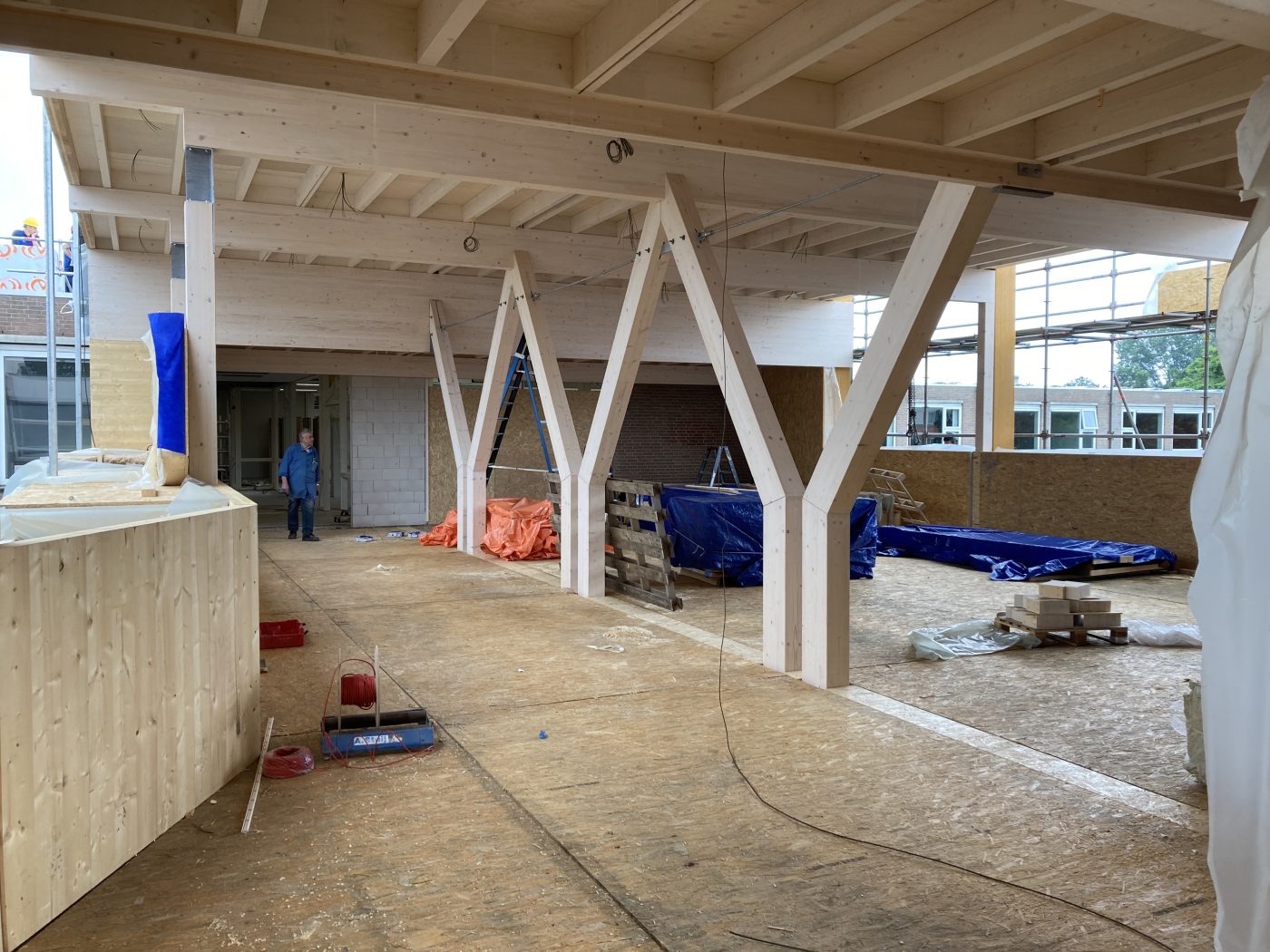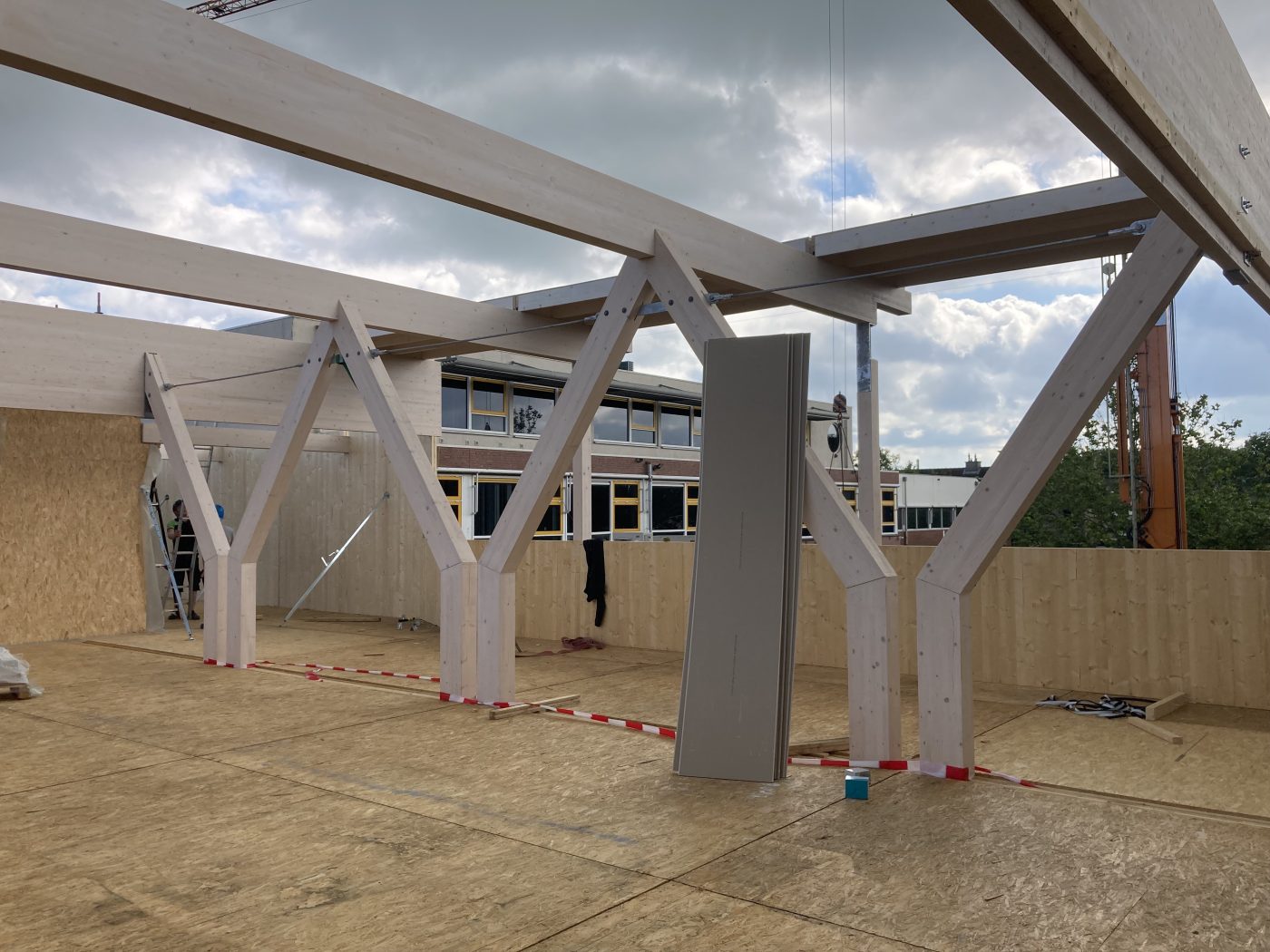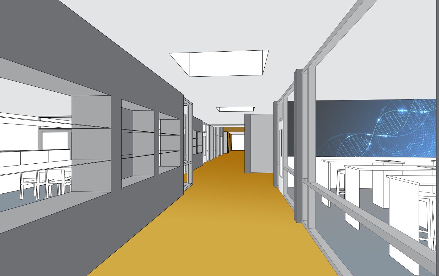 Het ontwerp ondersteunt een onderwijsvisie waarin onderzoekend en projectmatig leren centraal staat. De plekken voor presentatie, ontmoeting en verdieping zijn voorzien van grote afbeeldingen die verwijzen naar de exacte vakken. De gehele inrichting van de ruimten is ook door ons bureau ontworpen. De ruimten worden gevormd door grote houten elementen met doorzicht en vitrines. Het gebruik van de lichte houttinten sluit aan bij de vormgeving van de nieuwe koppeling met de mediatheek. Deze is uitgevoerd in houtbouw: Y-vormige houtconstructies, CLT-wanden en houten ribbenvloeren. Houtbouw is niet alleen duurzaam, maar ook licht van gewicht en de toepassing van prefab elementen zorgden voor een kortere bouwtijd. De verbouwing moest namelijk plaatsvinden in de periode na de eindexamens en de start van het nieuwe schooljaar. Een lange gangzone langs de mediatheek verbindt de bestaande bouwdelen op de verdieping en verbeterd de logistiek. De lange gevel van dit verbindingselement is uitgevoerd in lichte translucente polycarbonaatpanelen, die overdag het licht naar binnen brengen en in de avond juist aan de buitenzijde oplichten.
