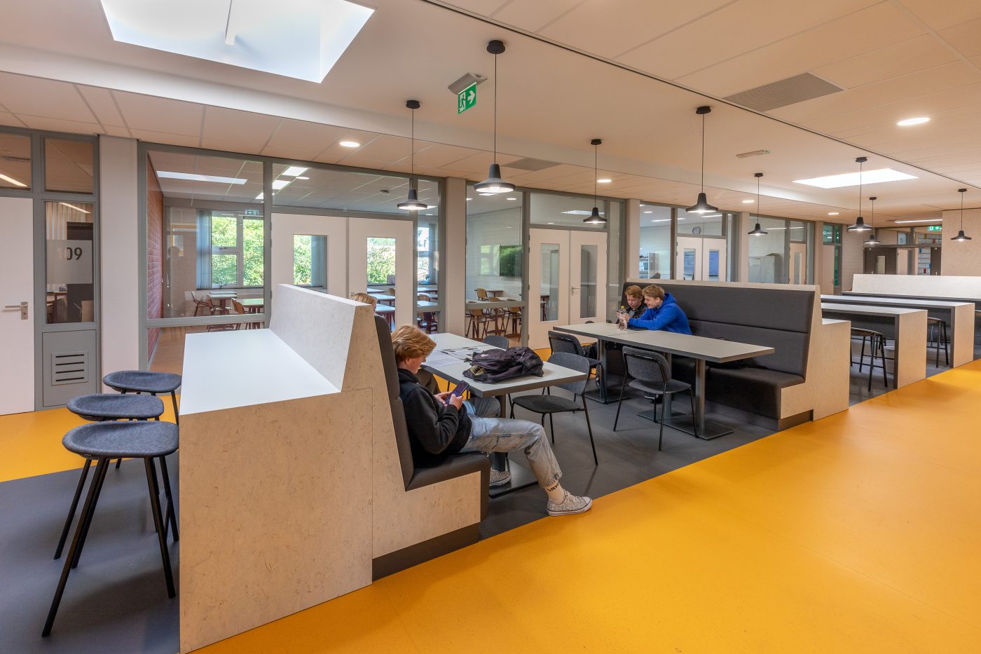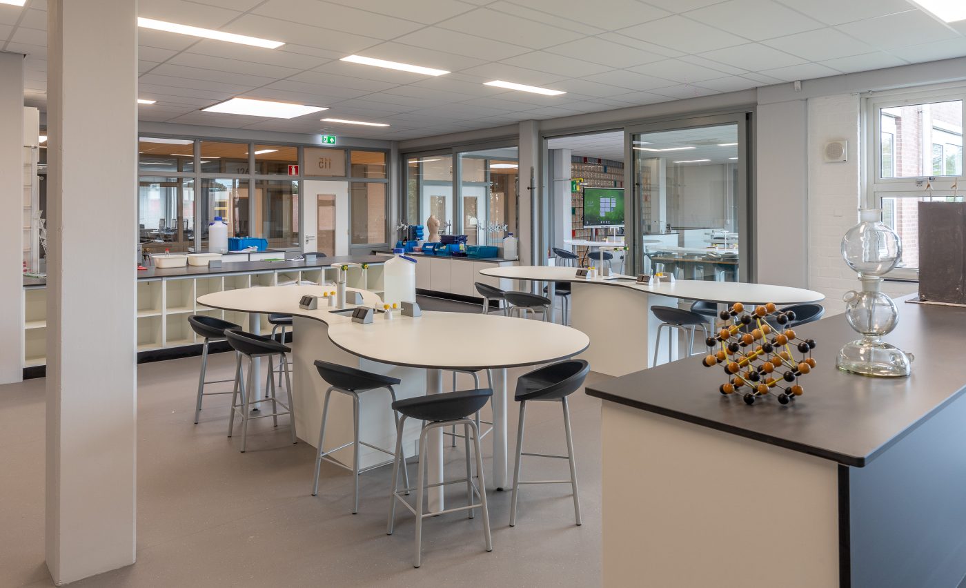 Het Pieter Groen College is gehuisvest in een goed functionerend, maar enigszins gedateerd schoolgebouw uit de tweede helft van de vorige eeuw. De opgave was om binnen de bestaande structuur een Science Centre te realiseren dat de exacte vakken samenbrengt en zichtbaar maakt binnen de school. Door de eerste verdieping van het zuidelijke bouwdeel te transformeren, ontstond een centrale plek waar biologie, scheikunde, wis- en natuurkunde elkaar ontmoeten. Open leerpleinen, science labs en projectruimten wisselen elkaar af en bieden ruimte voor zowel klassikaal onderwijs als zelfstandig en groepsgewijs werken. Meer transparantie en langere zichtlijnen zorgen ervoor dat het leren veel beter zichtbaar wordt in de verkeersruimten en daarmee bijdraagt aan de beleving van de school. Naast de interne herinrichting is ook de routing binnen de school verbeterd. De verbinding tussen de noord- en zuidvleugel is versterkt, waardoor oriëntatie en doorstroming logischer en vanzelfsprekender zijn geworden. Dit nieuwe verbindingselement bevat de docentenkamer en een uitnodigende mediatheek.